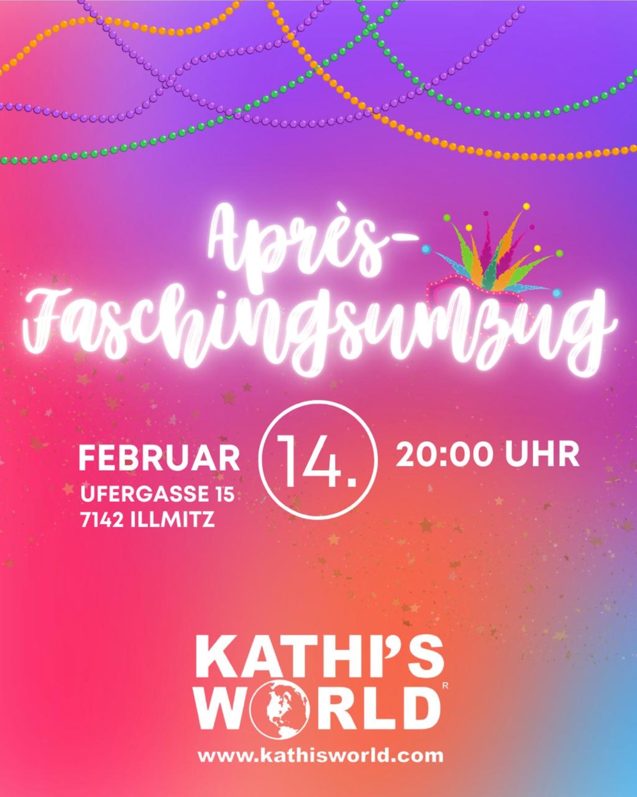 Nach dem Faschingsumzug ist noch lange nicht Schluss! Feiert mit uns, mit den besten Beats, ausgelassener Stimmung und jeder Menge Faschingsspaß. Komm verkleidet - das beste Kostüm gewinnt!